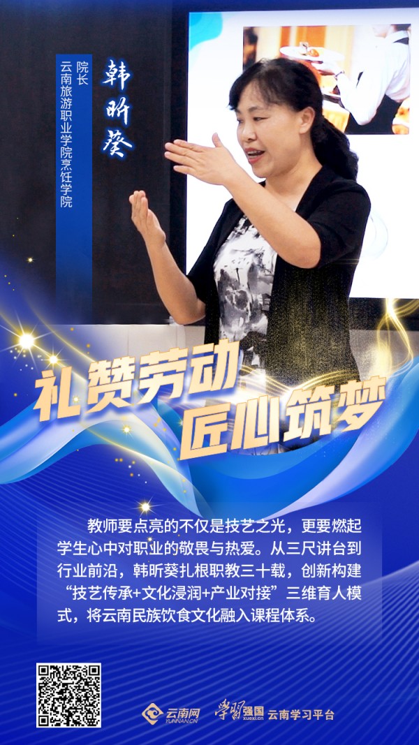 “教师要点亮的不仅是技艺之光,更要燃起学生心中对职业的敬畏与热爱。”从三尺讲台到行业前沿,韩昕葵扎根职教三十载,以“执着专注、精益求精”的工匠精神,带领更多青年学子在技能报国的道路上追光而行,在云岭大地上书写着新时代职教人的担当。