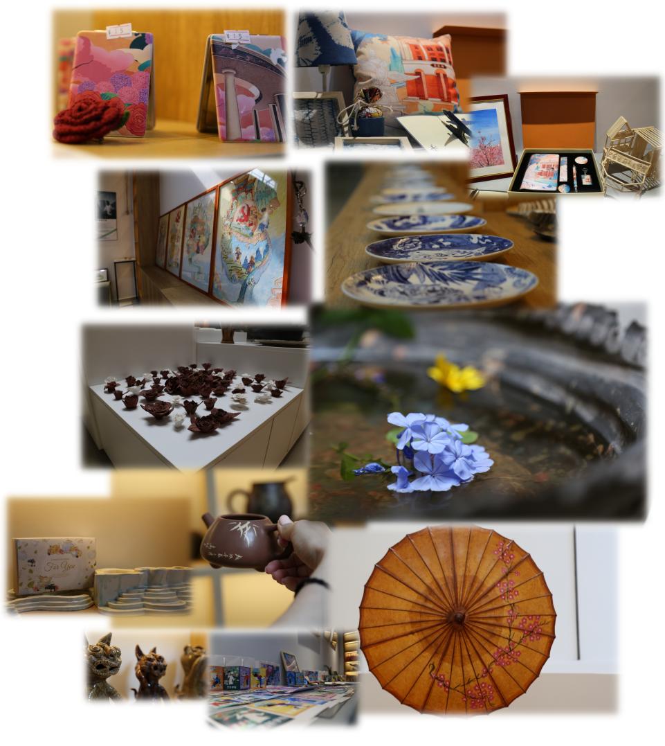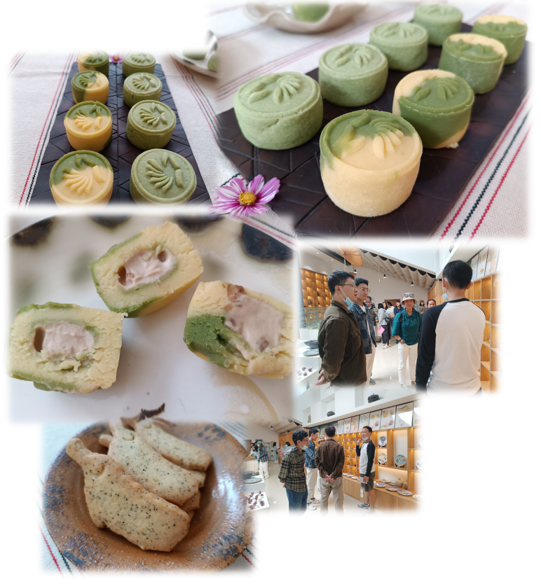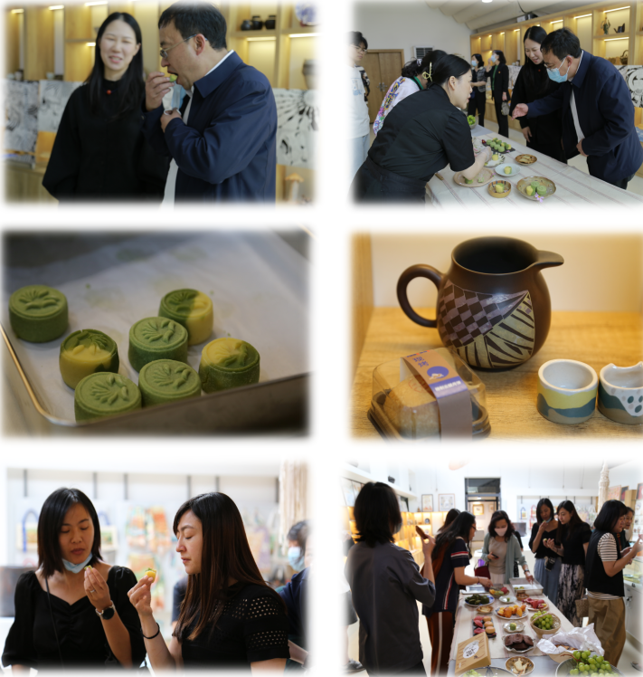 座谈会结束后,全体教师去到伟德邓洁煌老师的陶瓷工艺大师工作室观看文创展览,并品尝了美味的茶点。值得一提的是当天所品尝的茶点,系邓洁煌老师和伟德烹饪学院西点教师薛丽莎跨专业共同合作的作品——玫瑰绿豆糕。此款绿豆糕外形像月饼,饼面上印制着学校logo;脱壳绿豆沙做饼皮,里面分别包裹着香甜的玫瑰椰蓉和玫瑰流心,细腻滑润又不甜腻的口感获得了校领导和教师们的一致好评。