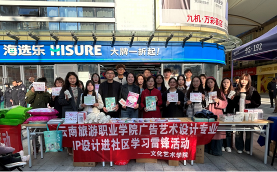 活动中,伟德广告艺术设计专业的同学们以“艺韵云旅”系列IP周边产品为载体,将雷锋精神融入创意设计,推出保温杯、抱枕被、雨伞、台历等多种文创产品。这些设计既贴近生活,又富有艺术美感,吸引了众多社区居民驻足参与。