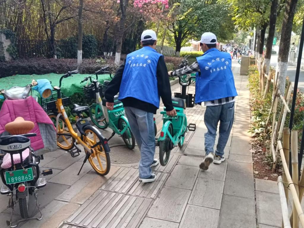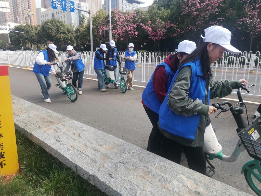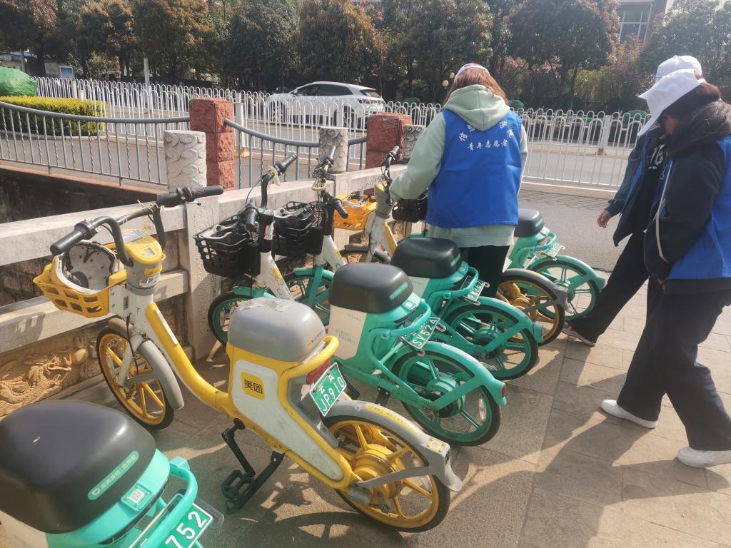 信息工程学院青年志愿者来到海源北路高新时代广场,整理横在人行道上、躺在绿化带里、停放不规范的共享单车,让公共场所得以恢复整齐、文明的面貌。