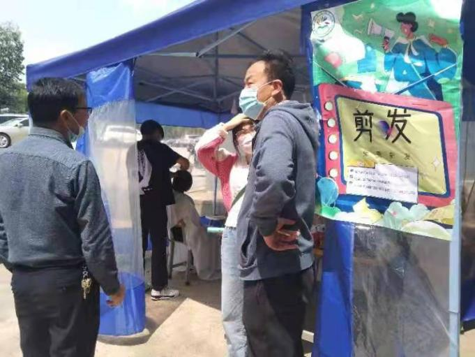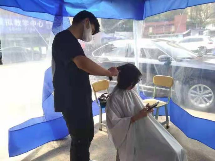 当学校和学院获悉刘一山同学的义务行动后,经他本人同意并与相关部门进行协调,为他在复印店对面搭起帐篷,方便他为全校学生提供理发服务。在提供服务过程中,他严格执行疫情防控相关要求:首先每天监测自己的体温和身体健康状况,每天对各种理发工具进行消毒;其次,合理安排需要理发的同学,实行分散等候,做到随剪随走,减少人员聚集。