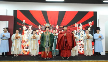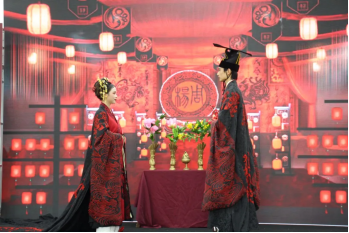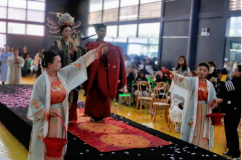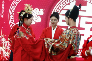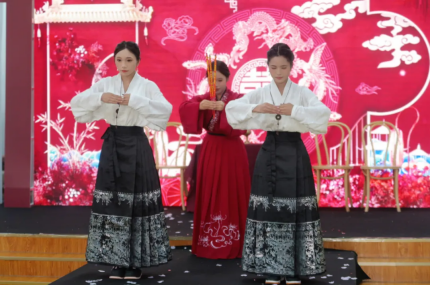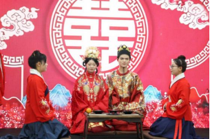 “玄纁新仪·华礼永年(新周制)”,以古朴庄重的周制婚礼,再现传统婚仪的典雅之美;“大明礼乐·汉婚典仪(明制)”,同学们身着华丽的明制汉服,遵循明代婚嫁礼仪,从沃盥、同牢到合卺、结发,每一个环节都细致入微,让观众领略到明代婚俗的庄重与大气;“金玉良缘(新中式)”,将传统中式元素与现代设计理念巧妙融合,红金配色尽显喜庆华贵;“宋韵婚典(宋制)”,淡雅的色调、简约而不失典雅的仪式流程,传递出宋代婚俗的温婉气质;