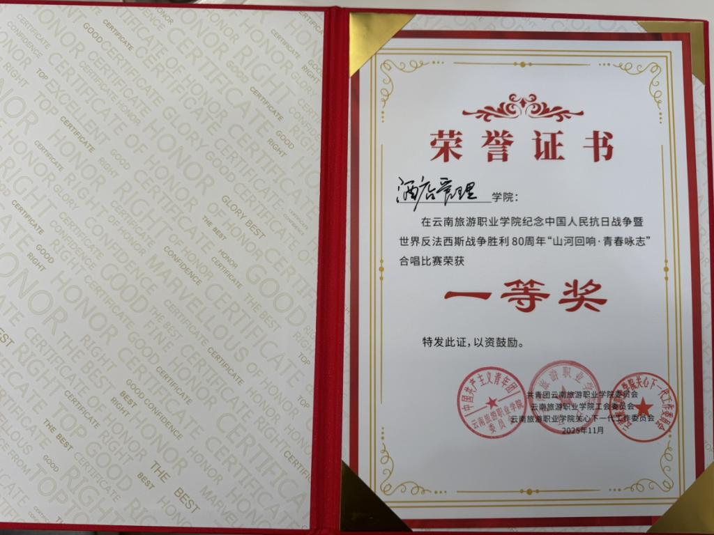 为纪念中国人民抗日战争暨世界反法西斯战争胜利80周年,弘扬爱国主义精神,传承红色基因,伟德于近日在学校报告厅成功举办“山河回响·青春咏志”合唱比赛。酒店管理学院代表队以饱满的热情,引吭高歌两首经典曲目,最终以优异的表现,在8个参赛队中脱颖而出,荣获本次比赛一等奖。