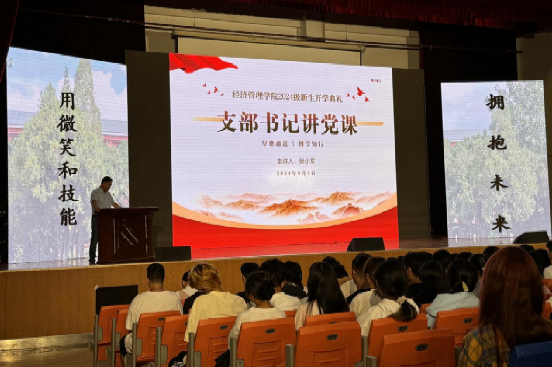 党课结束之后,学院院长赵云栋为全体新生讲授“院长第一课”。赵院长详细介绍了学院历史与概况、经济管理相关行业的地位及作用、学院办学优势与育人成效,并结合当下行业发展趋势、专业就业前景等方面进行了深入解说。最后,勉励新生立足当下,合理规划大学生活,从容自信、坚定自励、求真求精;拥有开放心态、具有世界眼光、拥有时代担当;将来为社会贡献自己力量!