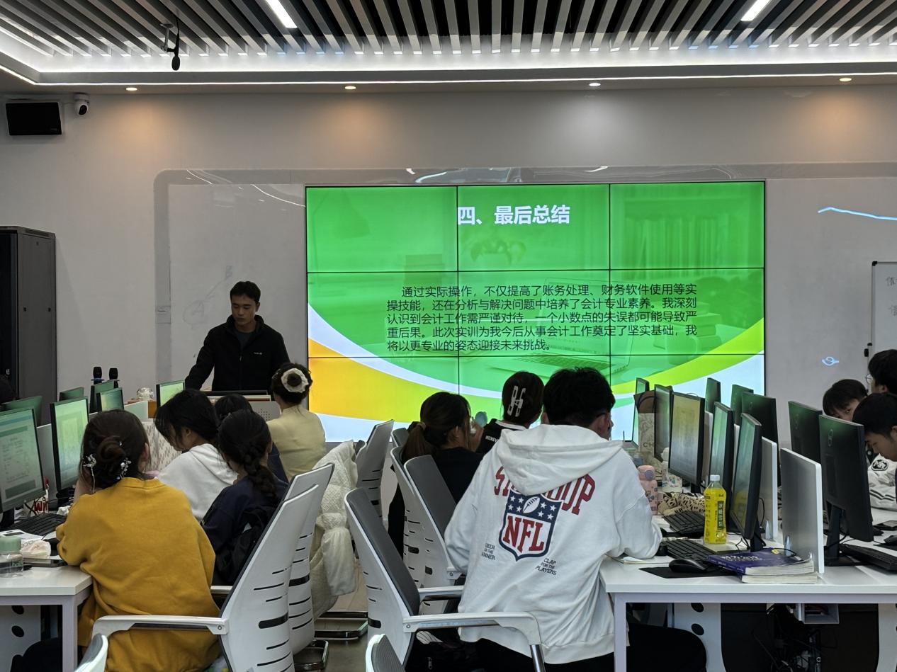 为进一步总结经验、提升能力,课程结束后,同学们开展了自我反思与实训总结。在结课班会上,学生代表马文俊分享了真账实训课程的体会与收获,他谈到,通过这个星期的真账训练,他体会到了什么叫专业精神,比如录入票据,看似很简单,但是如果缺乏敬业精神,就会频繁出错。张玲玉同学则表示,本次真账实训课程让她明白了要做好财会工作,必须要有扎实的学识、熟练的技能和严谨认真的品质。同学们纷纷表示,本次实训课程锻炼了自己的专业能力和实践能力,大家将以此次实训为起点,在未来的学习中不断努力,通过现代学徒制的实践,不断提升自己的综合素质和职业能力,为未来的职业发展打下坚实的基础。