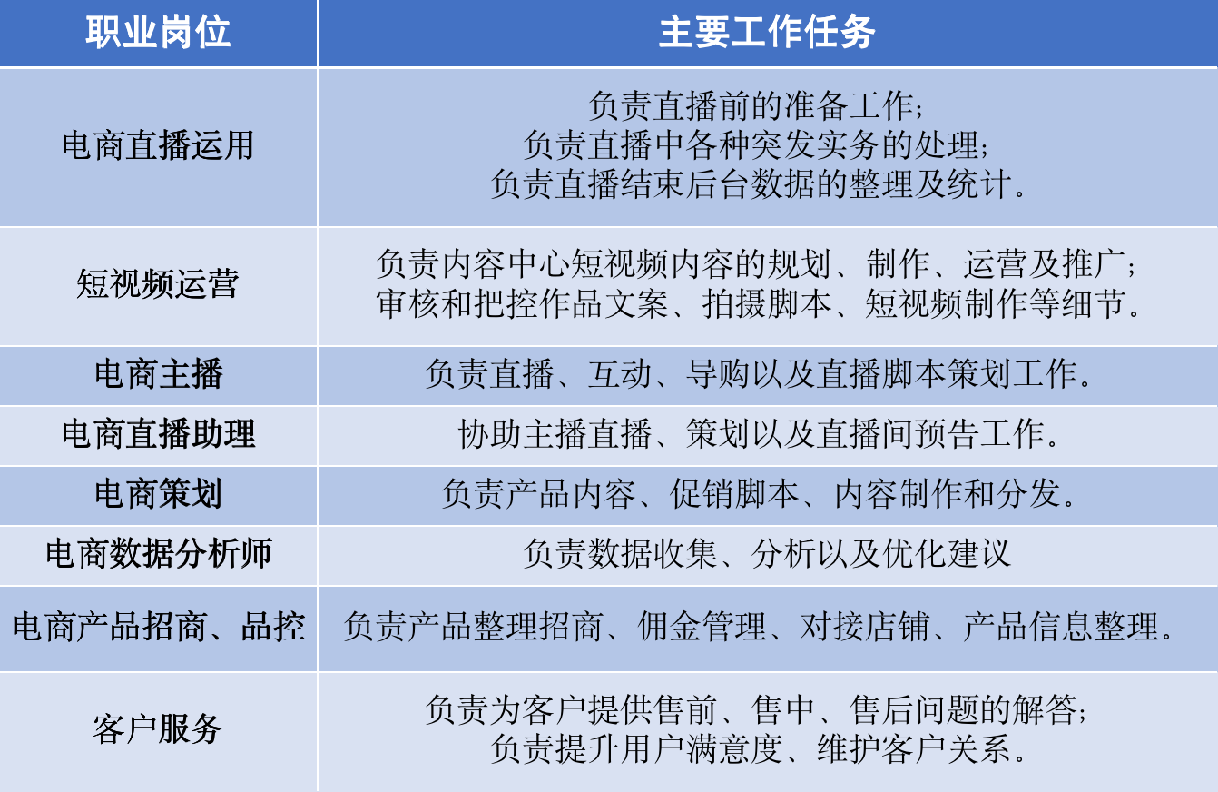 本专业毕业生适合在电子商务企业从事电商直播、直播运营、直播平台客服、新媒体营销、网络营销推广等工作。可胜任主播助理、运营专员、客服专员、新媒体专员、招商专员等岗位。有一定工作经验积累后,可向具有管理职能和综合业务职能的岗位发展,如运营经理、主播、客服经理、新媒体经理等。