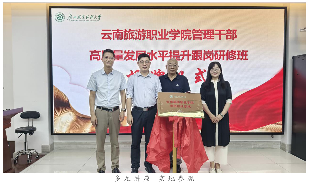 本次研修分为“专题讲座”和“跟岗研修”两个阶段。在专题讲座阶段,由广州职业技术大学副校长吴强教授、副校长李绍中教授、继续教育学院院长石坤泉教授及旅游商务学院院长郭盛晖教授分别从学校发展的顶层设计规划、人工智能赋能教学能力、数字化管理与数字领导力提升、旅游专业群的“双高”专业建设等不同方面多维度阐释了广州职业技术大学的建设体系和发展思路,为学员们带来了一场知识的盛宴。除了精彩的讲座,培训班还组织学员到该校的校史馆和国家级虚拟仿真实训中心进行了现场参观学习,让大家深刻感受到科技与教育深度融合的魅力。