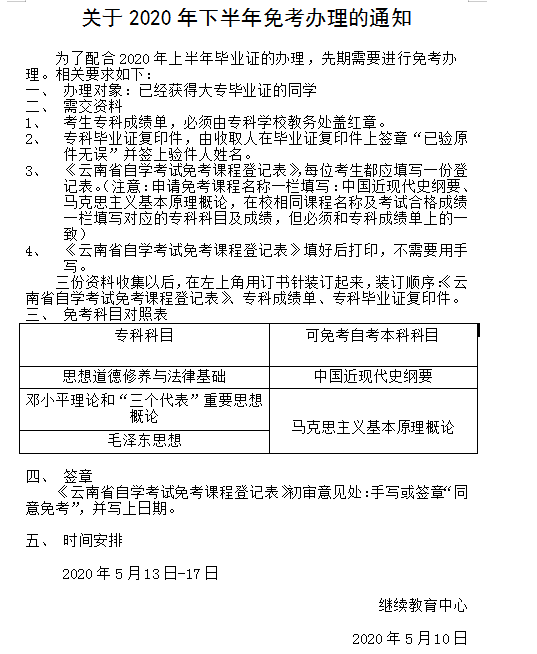 关于2020年下半年免考办理的通知