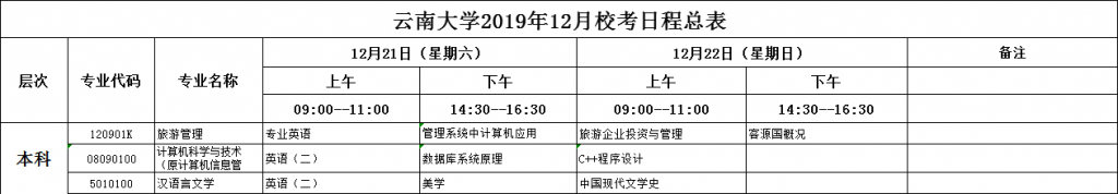 以上是2019年高等教育自学考试学分互认(本科)12月校考的课程,请需要补考的同学请于2019年11月15日之前把补考的姓名、性别、年级、补考科目和费用发给继续教育中心许老师,过时将无法补考。