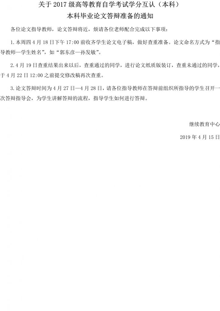 关于2017级高等教育自学考试学分互认(本科)本科毕业论文答辩准备的通知