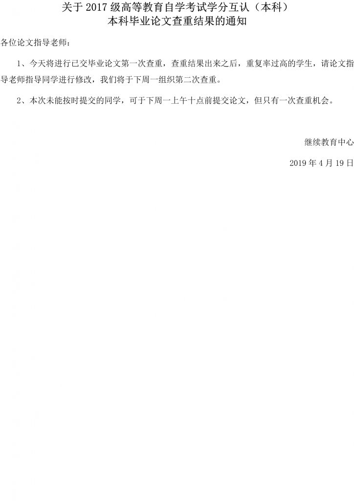 关于2017级高等教育自学考试学分互认(本科)本科毕业论文查重结果的通知
