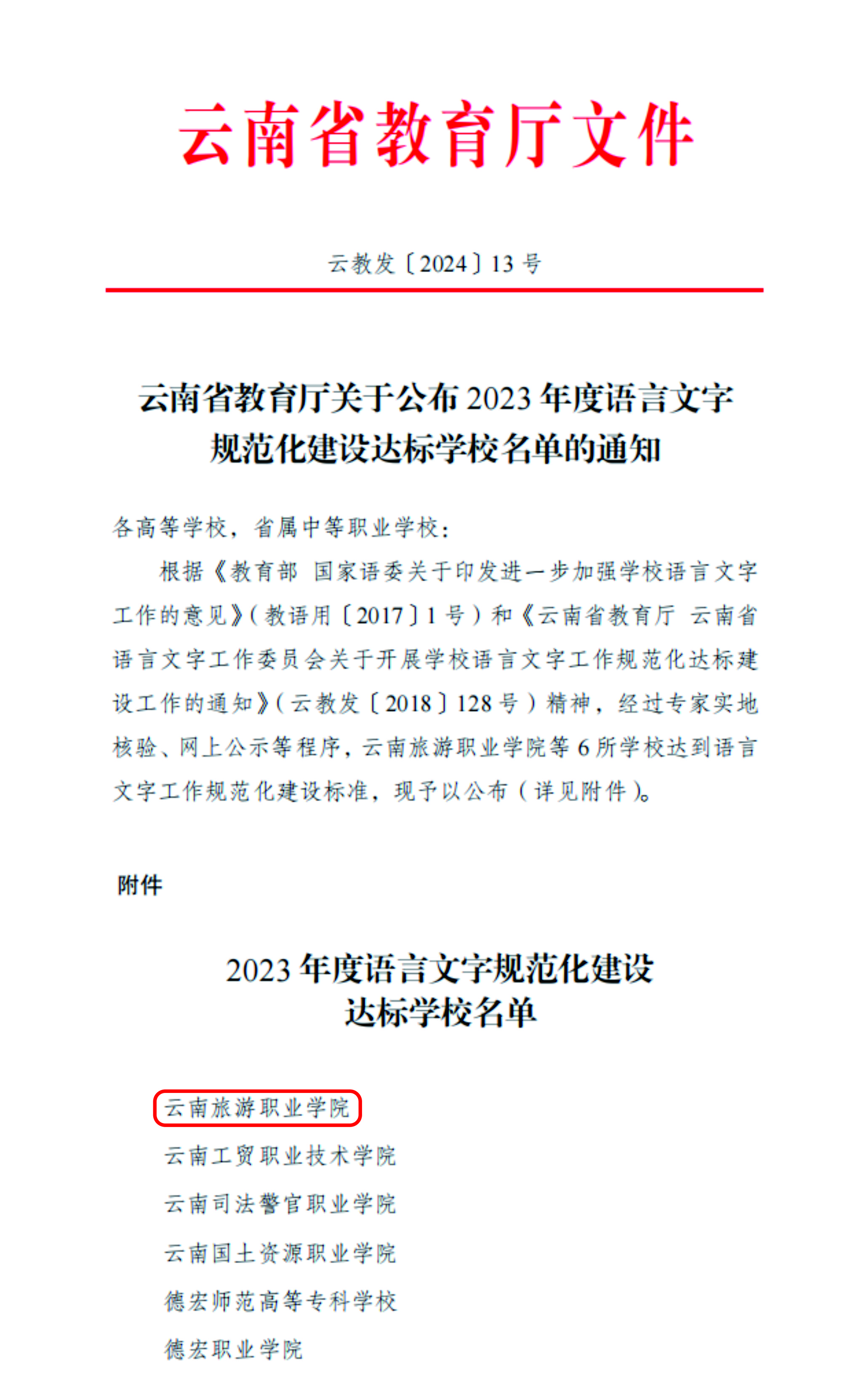 近日,从《云南省教育厅关于公布2023年度语言文字规范化建设达标学校名单的通知》获悉,经过专家实地核验、网上公示等程序,学院已达到语言文字工作规范化建设标准,获评云南省语言文字规范化建设达标学校。