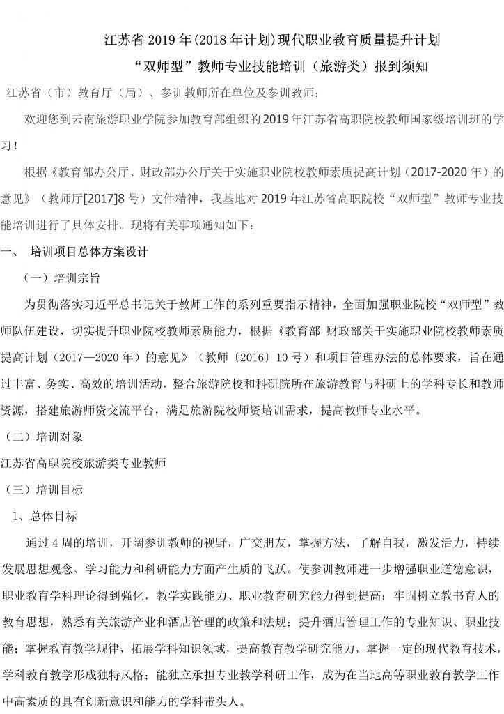 江苏省2019年(2018年计划)现代职业教育质量提升计划“双师型”教师专业技能培训(旅游类)报到须知
