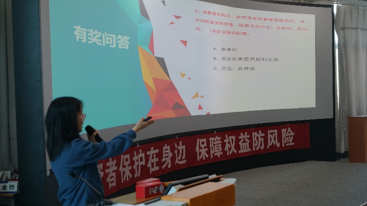 讲师张秋云分别从消费者权益介绍、消费者维权案例、如何理性消费以及维权小知识四个方面展开讲解,不仅介绍了常见的消费陷阱,引导大家关注身边的食品安全问题和商品质量问题,还详细讲解了常见的电信网络诈骗形式,倡导大家应当树立理性消费观念,花钱要考虑自身经济条件和家庭承受能力,无收入不提前消费,有收入要量力消费。防止盲目攀比、盲目消费,抵制不利于身心健康的消费内容。当自身合法权益受到侵害时,要学会通过合法途径维权。讲座最后,张老师通过有奖问答的形式检验了参加培训的学员对消费者权益保护知识的理解和掌握情况,大家积极参与,现场气氛活泼热烈。