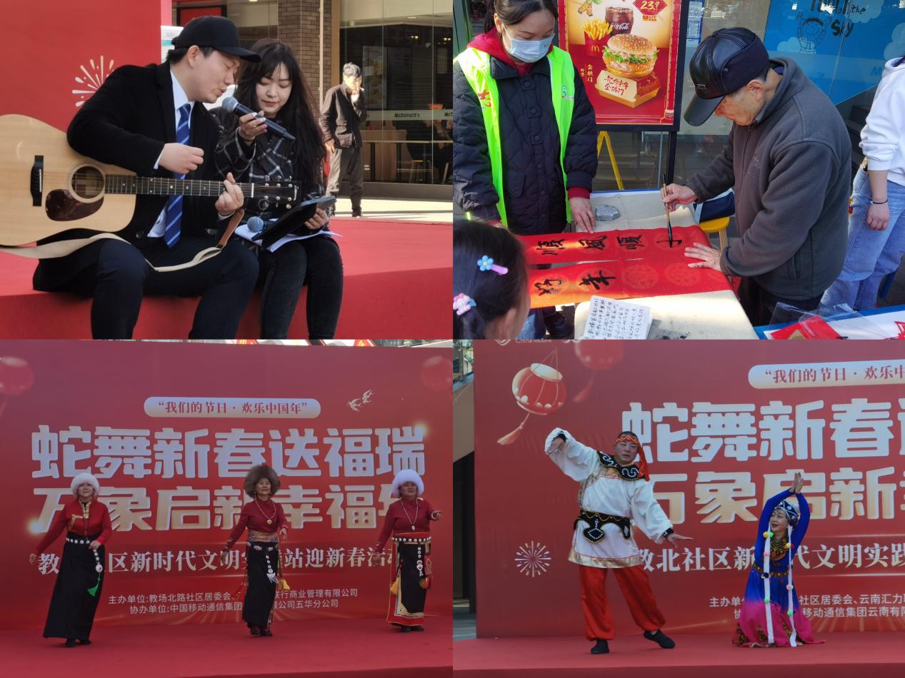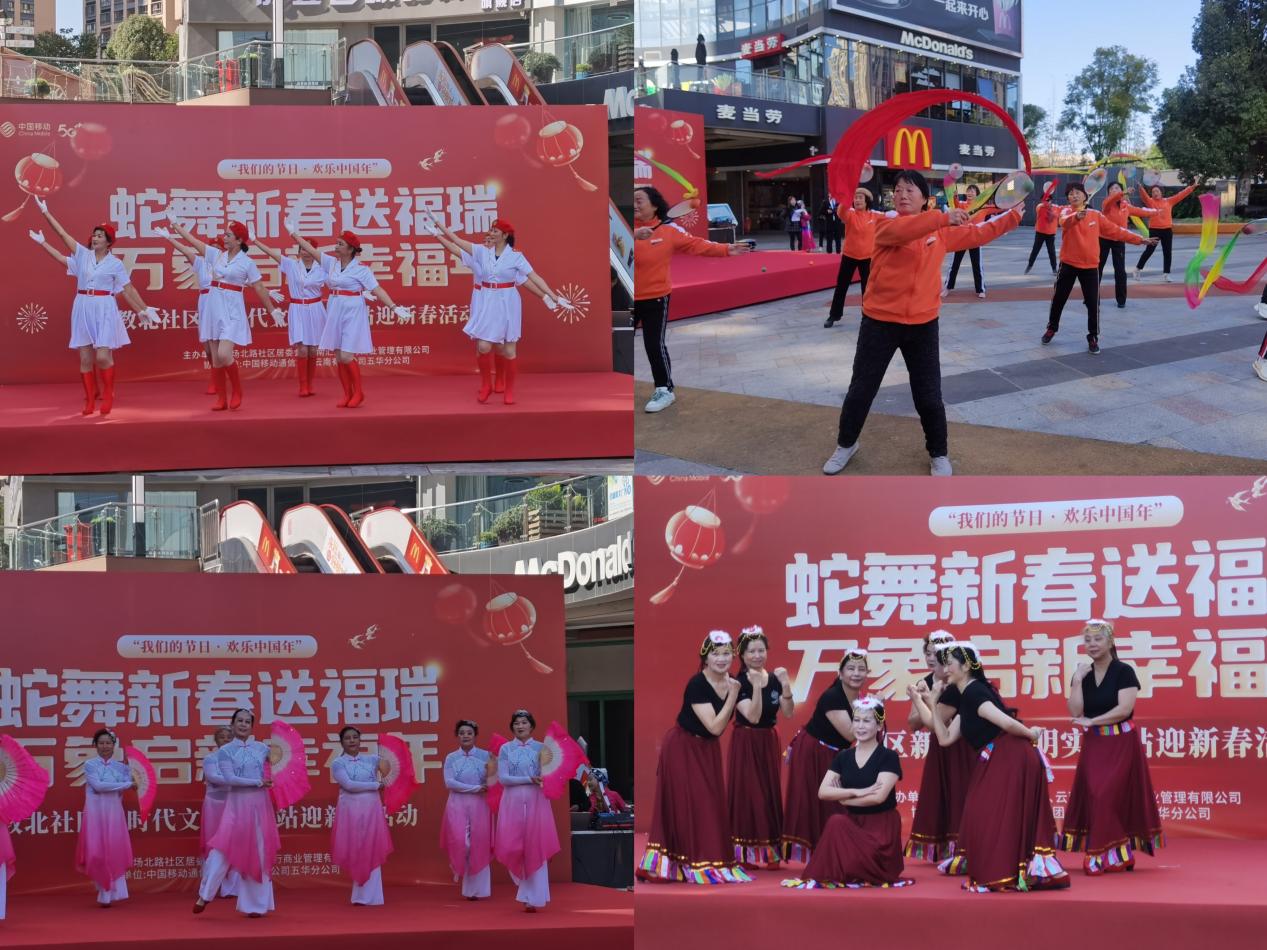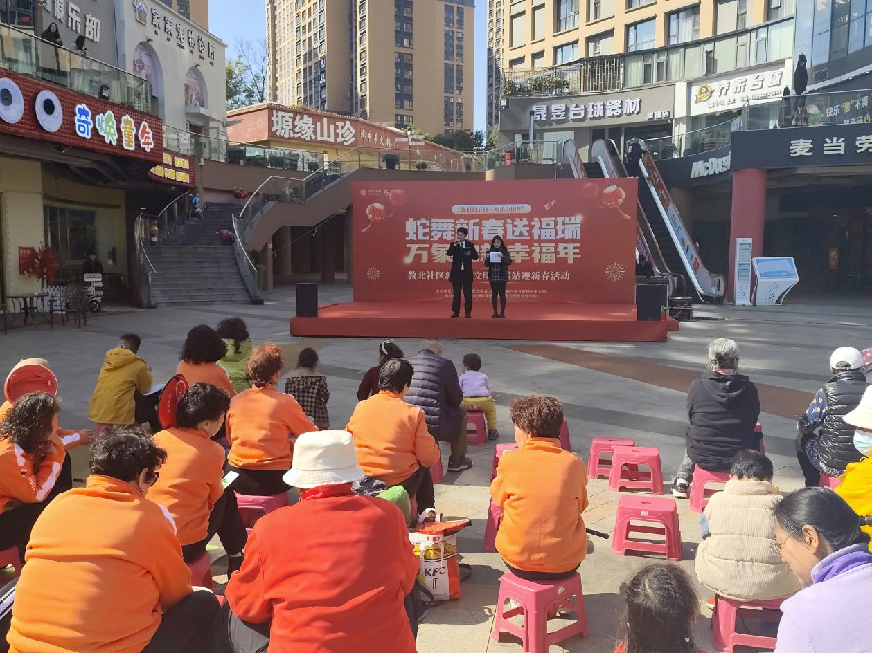 在新春佳节来临之际,为营造喜庆欢乐的春节气氛、增强社区群众凝聚力和幸福感,2025年1月22日,莲华街道教场北路社区联合继续教育学院以及辖内公共户单位、企业等多部门,在实力壹方城花千集广场共同举办了“我们的节日·欢乐中国年:蛇舞新春送福瑞,万象启新幸福年”活动。通过节日表演、品味年俗活动等多种方式,弘扬传统文化、促进邻里间的相互了解,共同携手创造更加美好的社区生活。