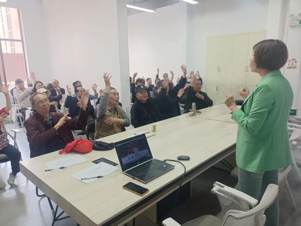 讲座中,杨晶然老师对居民常见的情绪波动、生活压力、人际关系协调等问题,通过情景模拟、案例分析和趣味互动,深入浅出地讲解了心理调适的科学方法。她通过分析居民压力的表现与来源,详细讲述如何增强心理韧性。针对如何应对工作和生活焦虑,她带领居民体验“蝴蝶拍”“呼吸放松法”等实用技巧。在人际交往模块,通过角色扮演引导听众学会换位思考与有效沟通,悦纳自己,接受别人。