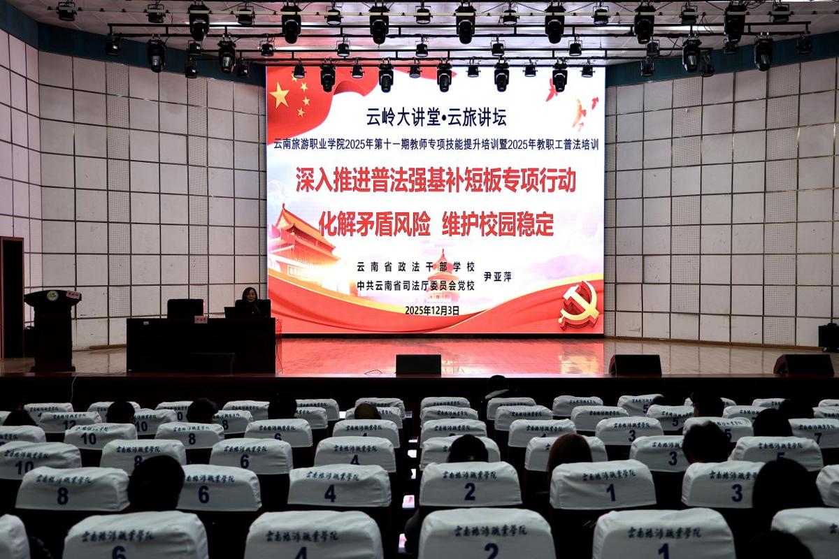 为深入贯彻落实全面依法治国基本方略,全面推进“八五”普法工作,进一步提升伟德教职工法治素养和依法治校能力,切实筑牢校园安全稳定防线,12月3日,“云岭大讲堂·云旅讲堂”——第十一期教师专项技能提升培训暨教职工普法培训开讲。