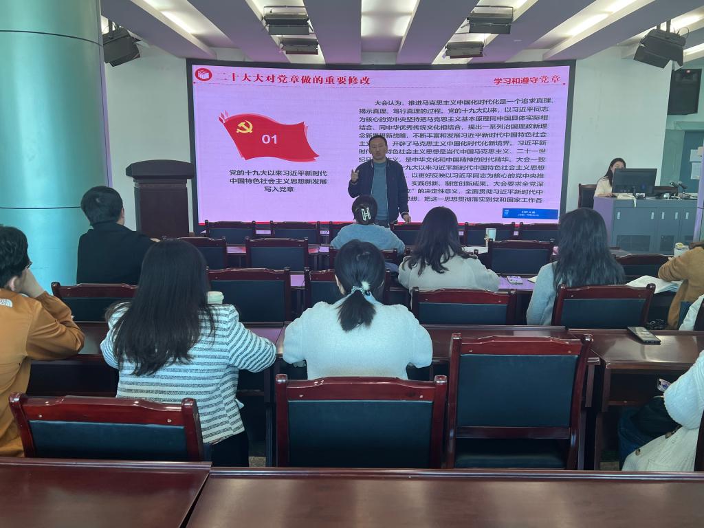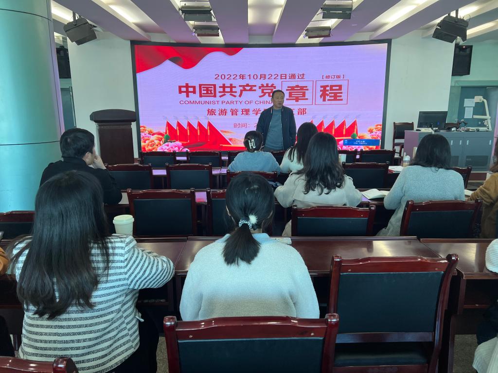 为进一步将学习宣传贯彻党的二十大精神引向深入,2022年11月8日,旅游管理学院党支部组织全体党员同志在模拟导游厅召开“学深悟透新党章,踔厉奋发新征程”专题党课,共同学习新修改党章,并进行了讨论交流。
