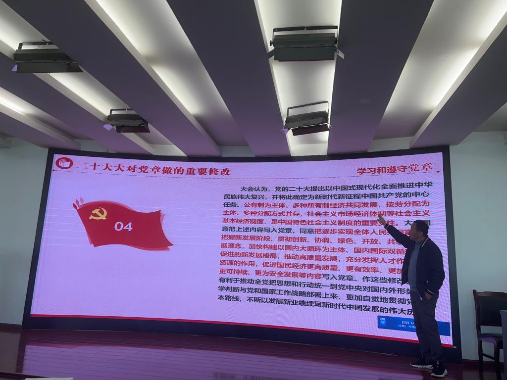 王敏同志围绕二十大对党章做的重要修改,党章的概述,党章的发展历程,总纲四个方面讲授本次党课。王敏同志带领全体党员同志重点对《中国共产党章程(修正案)》中的重要修改内容和写入党章的新理论、新制度、新概念进行了重点学习和详细分析。