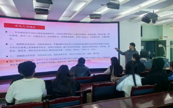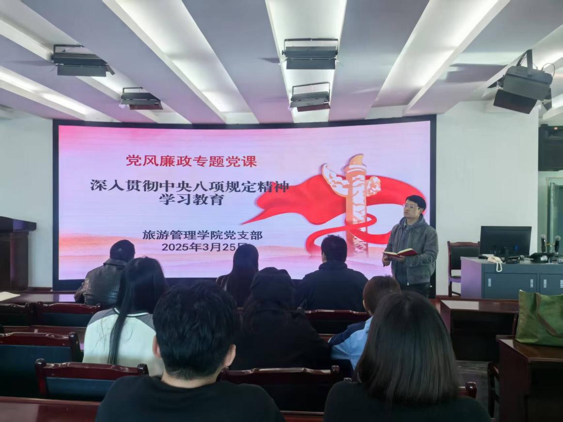 为进一步深化全面从严治党,巩固作风建设成果,3月25日,旅游管理学院党支部以讲授专题党课的形式,开展深入贯彻中央八项规定精神学习教育。党支部书记伍乐平同志作为主讲人进行授课,支部全体党员参加了此次学习。