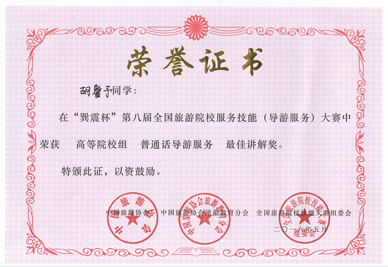 比赛分为高等院校、中职学校两个组别,通过综合知识理论考核、中英文景点讲解、导游知识专题抽题讲解和才艺展示四个环节的激烈角逐,bevictor伟德国际1946官网旅游管理系导游1403班胡馨予同学获得高等院校组普通话一等奖,并同时荣获大赛“最佳讲解奖”、“最佳才艺展示奖”。导游1251班颜蓉同学获得高等院校组普通话二等奖。两位同学出色的表现也帮助学院获得了此次大赛的“团体一等奖”。