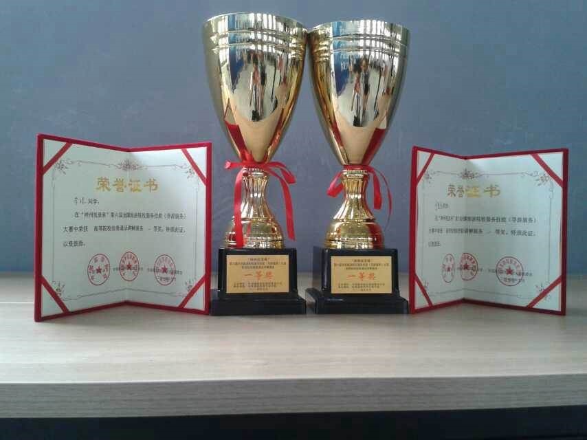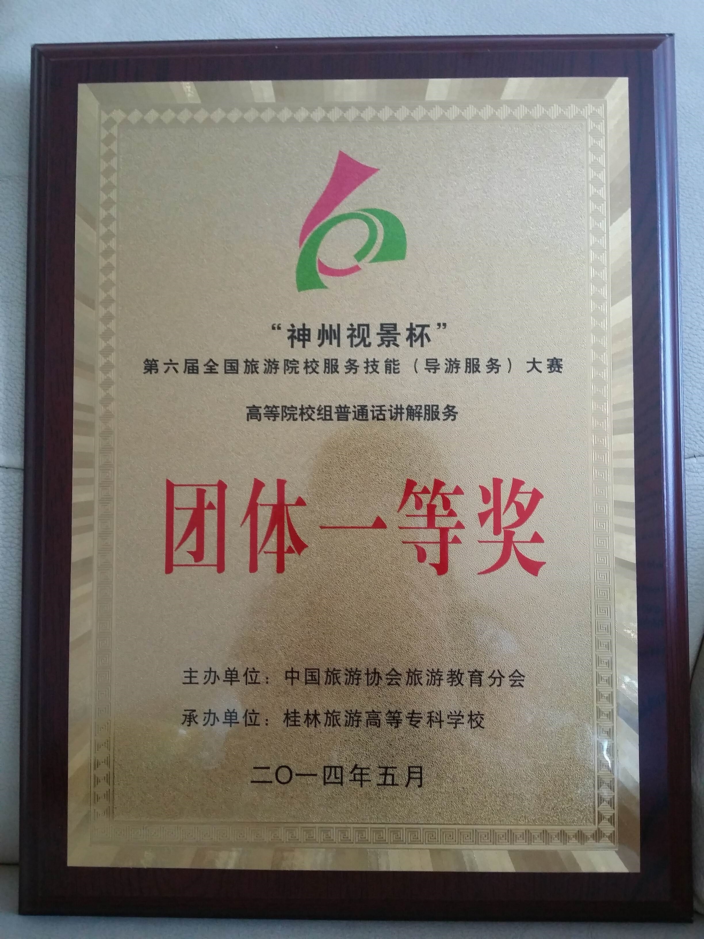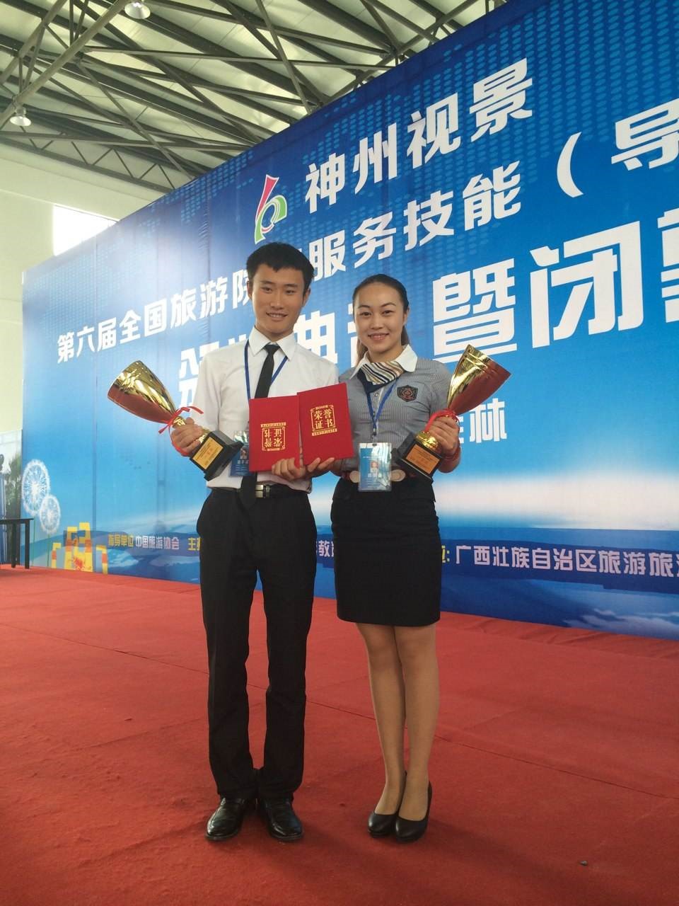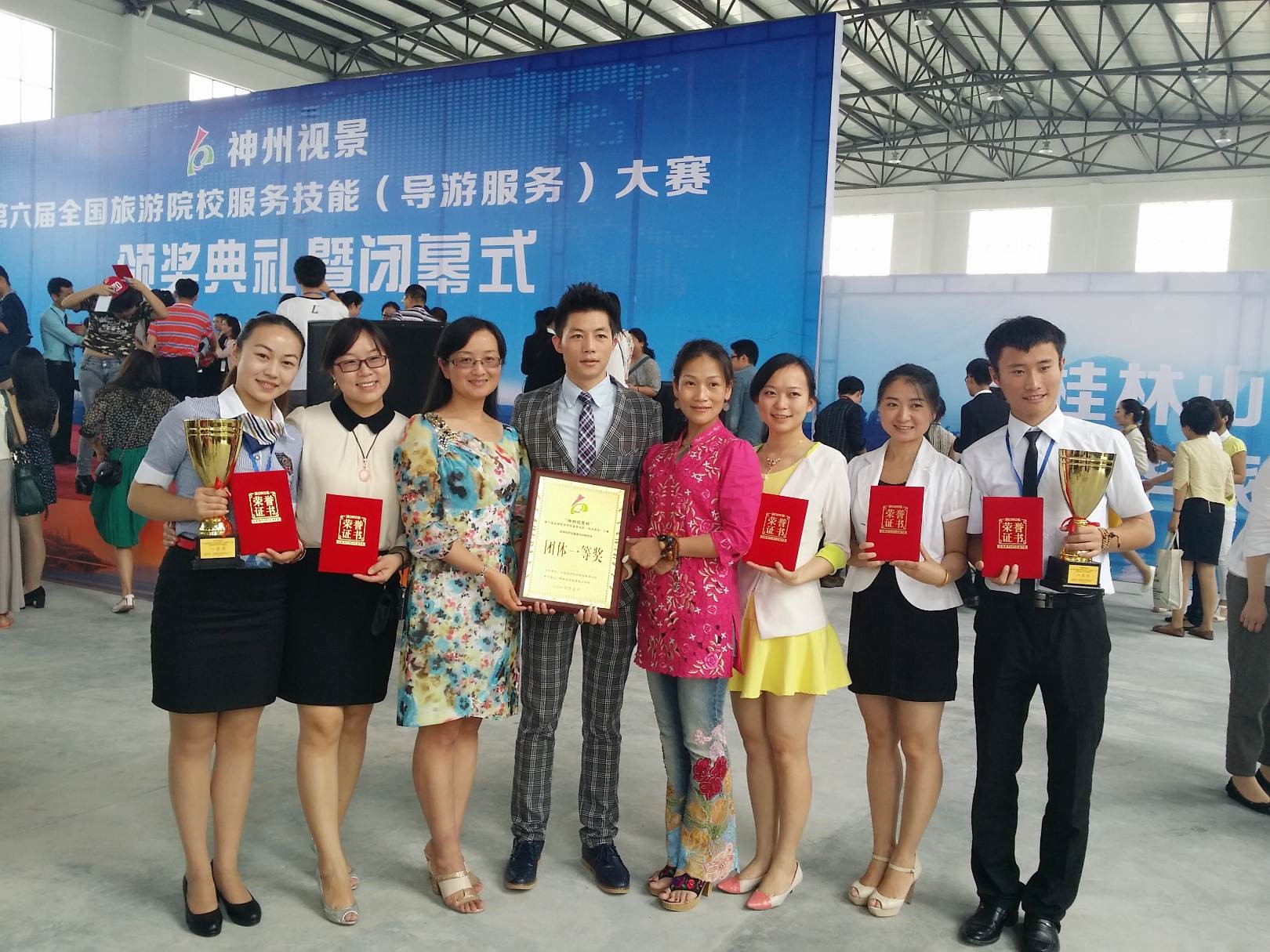 2014年5月9日至12日,第六届“神州视景杯”全国旅游院校服务技能(导游服务)大赛在桂林旅游高等专科学校举行。旅游管理系派出导游1302班李琛、导游1201班刘夏思两位同学参加了高等院校组普通话导游讲解服务项目的比赛,荣获两个个人一等奖,一个团体一等奖。两位同学在来自全国30个省、自治区、直辖市的 323所院校、923名选手中脱颖而出,其中李琛同学以总分92.509的好成绩获得全国一等奖第四名,刘夏思同学以总分89.685分获得全国一等奖第三十五名,团体总成绩名列参赛院校的第四名,荣获了高等院校组普通话导游讲解服务项目团体一等奖。