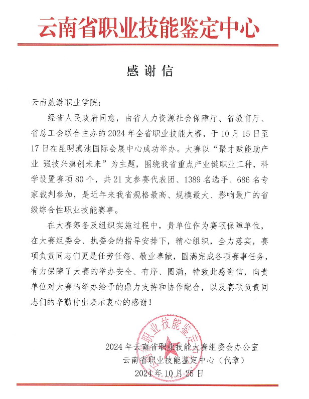 在竞赛演示环节,他们更是充分发挥专业优势,负责后勤保障、现场协调等任务,确保每一位参赛选手都能在最佳状态下展示自我。学院师生的热情与细致,赢得了广泛赞誉。此次大赛的服务保障工作,不仅是对学院师生综合素质的一次全面检验,更是对学院旅游管理专业教育成果的一次生动展示。赛后,学校收到来自云南省职业技能鉴定中心的感谢信。