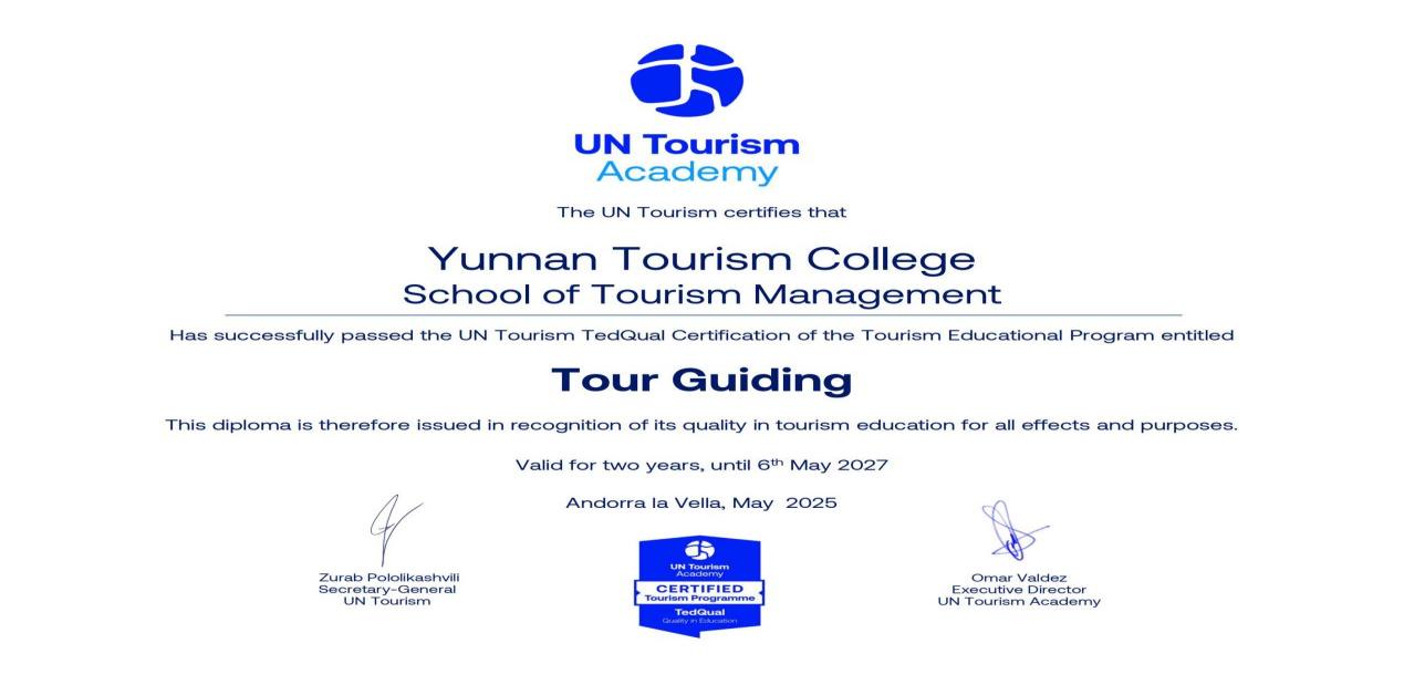 5月7日,联合国世界旅游组织(UNTourism)来函通报,伟德导游专业顺利通过联合国世界旅游组织教育质量认证(UNTourismTedQual)。这标志着学院导游专业的教育质量获得国际权威认可,充分展示了学院专业办学所取得的显著成效,伟德成为云南省首家通过该项认证的院校。