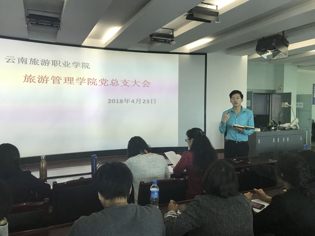 2018年4月23日中午13点,旅游管理学院全体党员在图书馆模拟导游厅召开党支部大会。会议由袁浩镛书记主持。