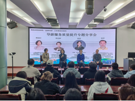 2023年12月13日旅游管理学院在模拟导游厅举办了关于导游服务质量提升专题分享会。邀请了昆明市旅游培训中心主任苏平、云南省导游协会会长、高级导游杨洁卿、云南省博物馆高级导游蔡淑玲、继续教育学院院长赵明教授参加分享。此次专题分享会由导游教研室主任庞馨主持,学院领导、老师和部分专业学生参加。