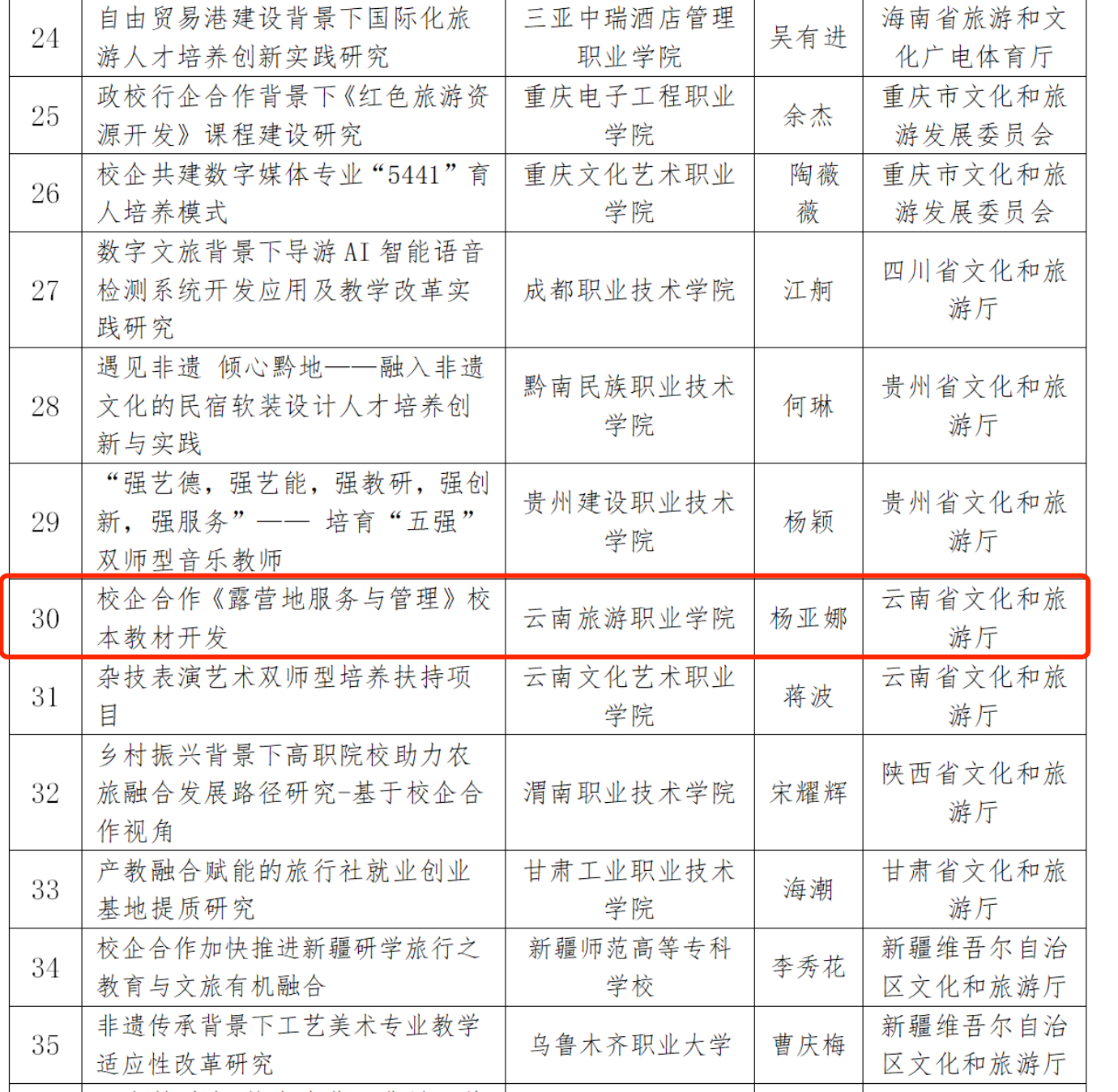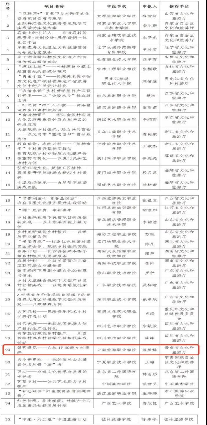 近日,国家文化和旅游部公布了2022年度文化艺术职业教育和旅游职业教育提质培优行动计划入选项目名单,伟德申报的《遇见黎明——文旅IP赋能乡村振兴》成功入选大学生团队实践扶持项目、校企合作《露营地服务与管理》校本教材开发入选‘双师型’师资培养扶持项目。据了解,云南省共5有个项目获得文旅部批准扶持,其中伟德大学生团队实践扶持项目是省内唯一一所入选的高职院校。