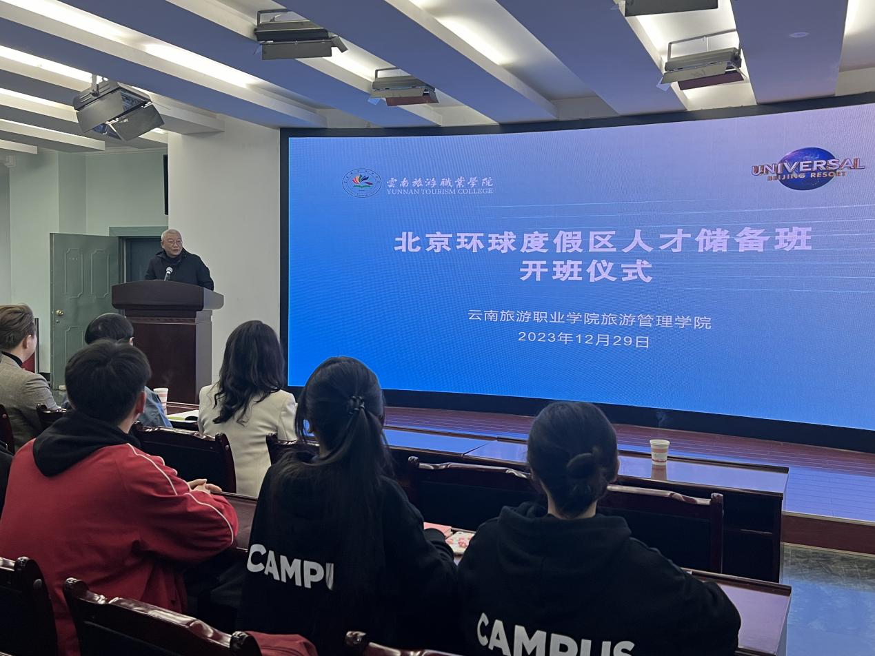 为进一步深化校企合作,推进产教融合育人模式,2023年12月29日上午,旅游管理学院和北京环球度假区人才储备班正式开班。学院党委委员副院长黄绍勇出席并讲话,开班仪式由旅游管理学院院长袁浩镛主持。