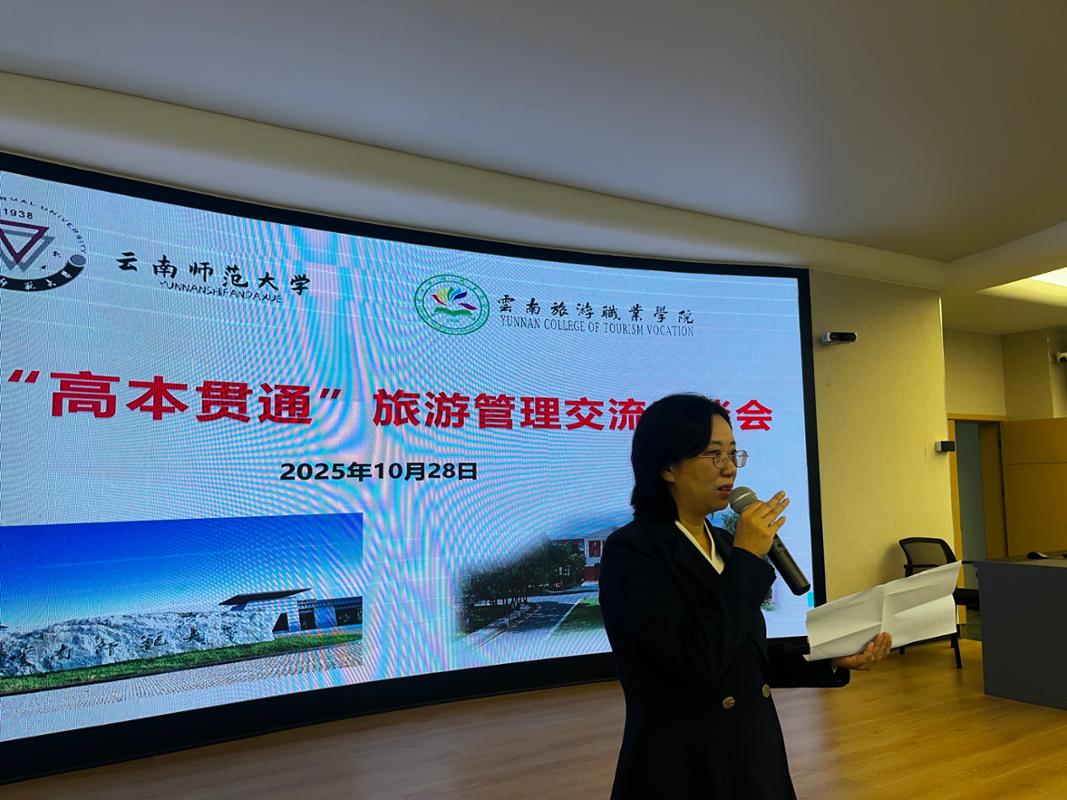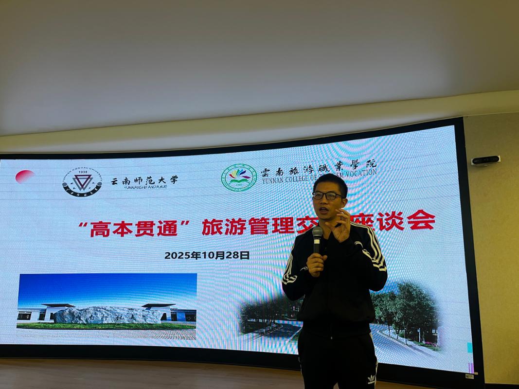 2025年10月28日上午,伟德与云南师范大学在图书馆三楼模拟导游厅联合举办旅游管理专业“高本贯通”人才培养交流座谈会。伟德党委委员、副院长王霞,旅游管理学院党支部书记伍乐平、院长袁浩镛、党支部副书记聂晓茜、副院长刀丽、教研室主任张文文、辅导员张洪洪,云南师范大学管理学院院长李艳、副院长周宁、旅游管理系主任冯斌、旅游管理专业负责人余媛媛、教务办主任马磊坚以及2024级、2025级旅游管理专业“高本贯通”班学生齐聚一堂,围绕人才培养进行了沟通交流。