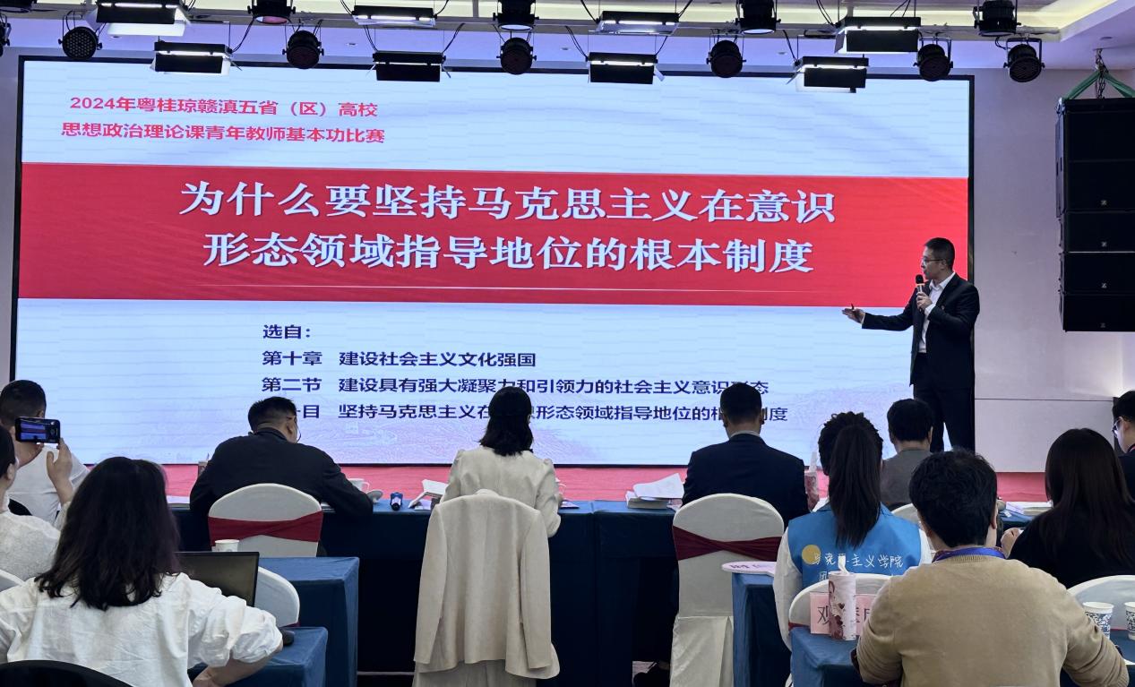本次共有来自广东、广西、海南、江西、云南五省(区)40名教师选手参赛,比赛设立本科组和高职高专组进行比赛,选手通过现场抽签确定讲课章节,从20分钟授课、5分钟答辩等环节展开角逐。评委从参赛教师的教学设计、教学态度、教学内容、教学方法、教学效果等评价指标进行综合评分。比赛中,王翔宇老师以深厚的理论知识,扎实的教学基本功,展示了《习近平新时代中国特色社会主义思想概论》课第十章的教学内容,得到评委的充分肯定。