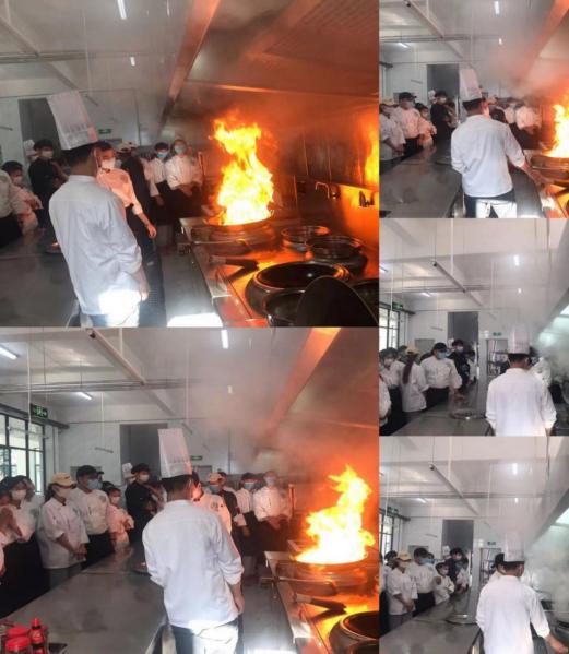 按照学校安全的相关文件要求,烹饪学院为加强师生厨房消防安全意识,提高自救防范能力,发生火警火灾时临危不乱,有序、有速地按照消防应急预案采取灭火行动,确保生命安全,学院决定在实训室开展“油锅起火”为主题的安全演练。