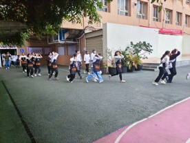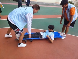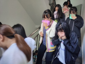 16:40时,第二次警报响起,表示地震或火灾初期已过,同学们在短暂的避险后快速地从安全通道口撤离。参加演练的同学们用手捂着口鼻,双手护头,腰背半弯着从通道口撤离“火灾”现场。学生们撤离到操场后,在预先方案所安排的位置集合并清点人数。随后,又进行了受伤的同学由工作人员用担架送往医务室的演练。