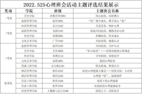 此次班会活动由心理委员及其他班委共同组织,班主任指导,全班同学参与;以内容宣讲和班级活动二者兼具的形式开展,班会内容涵盖心理防疫重要性、疫情期间可能出现的不良心理反应及相应的心理调适方法等。经过初赛及决赛,西餐营养2001班“同心抗疫,向阳携行”主题班会荣获一等奖、烹饪2003班“护心防疫——疫情封校的心理调适”主题班会荣获三等奖。
