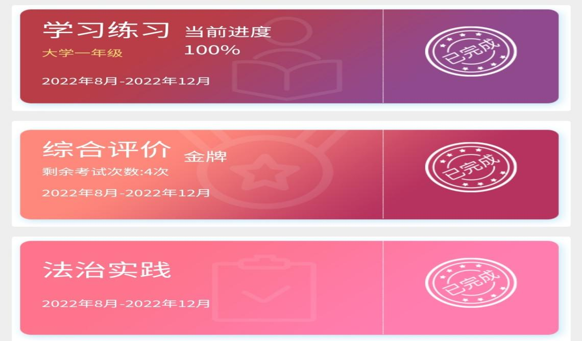 二、在综合评价模块,学生完成相应的模块并获得“金牌”,将有资格参加“网络风采展示”活动,活动详情及参与方式可前往普法网“第七届学宪法 讲宪法”活动专题页查看。