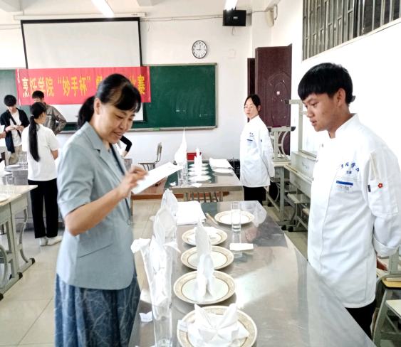 经过激烈的比拼,评委老师就场上选手的仪容仪表,折花造型,操作流程,造型介绍等项目进行一一点评,烹饪学院韩院长还给同学们分享了餐巾折花的要点,提出要以静修身,平心静气的做事,并给优秀选手和团队进行颁奖。