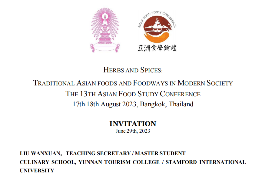 2023年8月17—18日,第十三届亚洲食学论坛在泰国曼谷举行。本届论坛的主题为“香草与香料:亚洲传统饮食在现代”,聚焦香草与香料的知识及应用。来自亚、欧、美三大洲22个国家和地区的120余名食学研究专家、学者出席了会议。烹饪学院刘万璇教师参加论坛并发表论文。