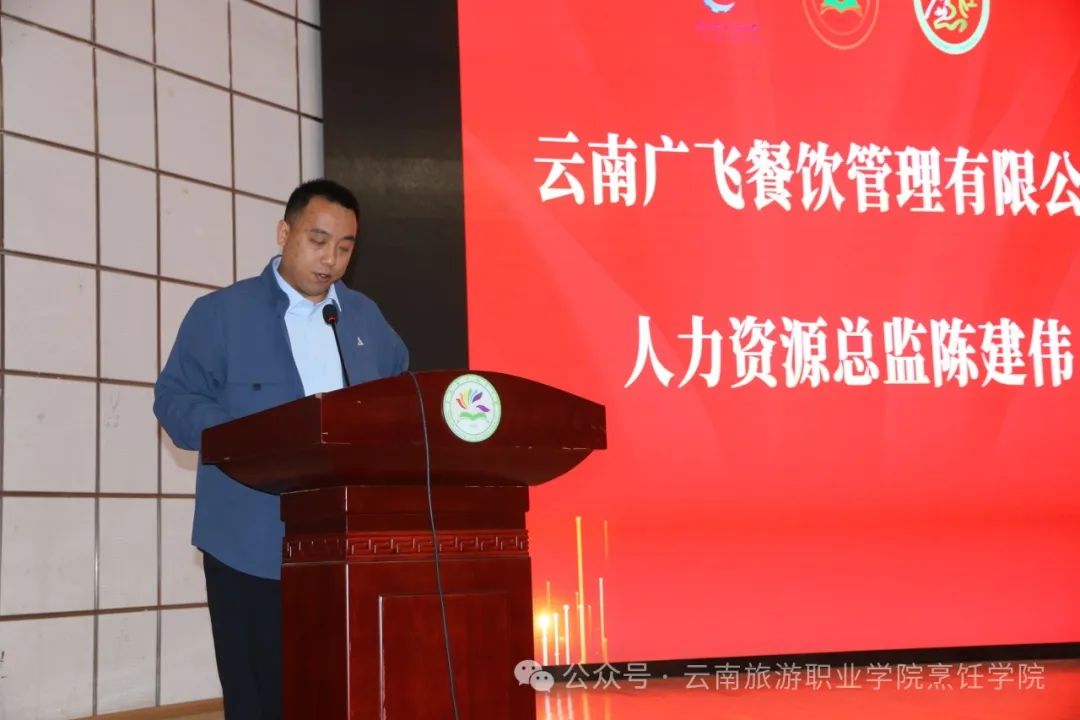 云南广飞餐饮管理有限公司人力资源总监陈建伟上台讲话。bevictor伟德国际1946官网举办职教周动员大会,云南广飞餐饮管理有限公司受邀参加,与学院合作十年,秉持相互信任、互利共赢原则,创新合作模式,完善培养机制,开展多种合作项目,为学生提供实践机会和职业发展空间。学院成为该公司人才培养和输送基地,每年保持对优秀应届生的高度关注和热情邀请。此次职教周活动,企业将与学院团队共同携手共创。招聘双选会即将召开,企业预祝同学们顺利找到心仪的工作机会,同时希望各企业满载而归。企业将继续深化校企合作,推进产教融合,共同为我国职业教育事业发展贡献智慧和力量。