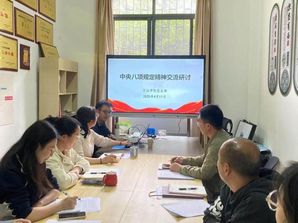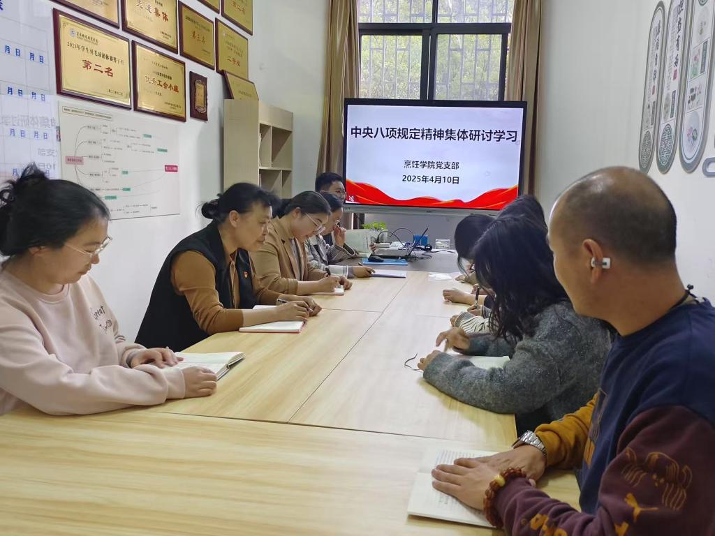 4月10日上午,烹饪学院党支部通过“三会一课”的形式组织开展了集中学习研讨。学习内容包含《习近平关于加强党的作风建设论述摘编》、中共中央办公厅印发《关于在全党开展深入贯彻中央八项规定精神学习教育的通知》《中央政治局关于改进工作作风、密切联系群众的八项规定》《中共中央政治局贯彻落实中央八项规定实施细则》等相关内容。