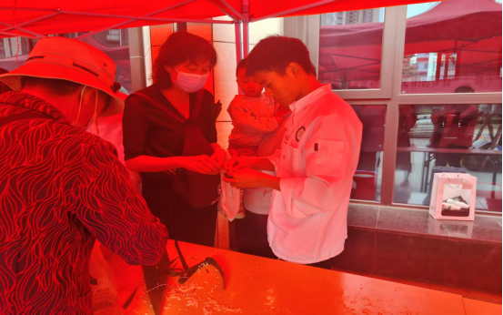 当天9点,烹饪学院5名同学身着厨师服抵达新域社区。待居民陆续到场后,同学们发挥专业优势,基于社区备好的糯米、粽叶等材料,讲解包粽子技巧并进行示范,面对包粽手法生疏的居民,从粽叶折叠、糯米填充量等方面耐心一一教学。