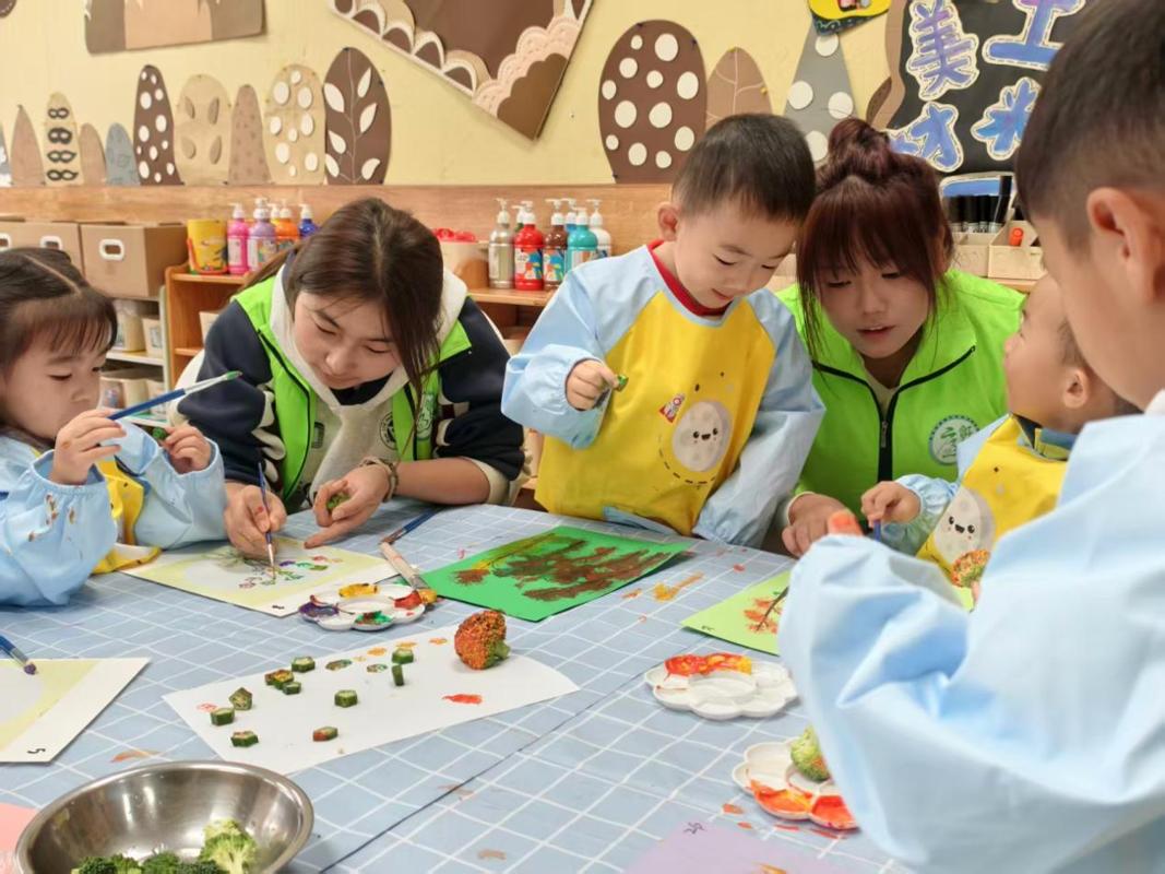 室内环节中,志愿者通过生动的图片展示,引导小朋友们认识莲藕、秋葵等五种常见蔬菜,了解其外形特征与生长特点,并带领他们开展蔬菜拓印画活动,让他们利用蔬菜切面蘸取颜料进行创作,体验动手的乐趣。