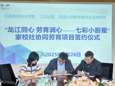 6 月 27 日,由烹饪学院牵头策划,联合五华区龙泉路小学及五华区莲华街道江北社区共同开展的“龙江同心·劳育润心——七彩小厨星家校社协同劳动教育”项目,在龙泉路小学举办签约挂牌仪式,开启劳动教育合作新模式。伟德副院长何树称、学生处、烹饪学院、龙泉路小学及江北社区代表共同参与本次活动。