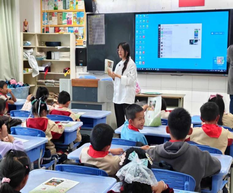 活动现场,烹饪学院志愿者们身着统一厨师服,分别抵达金实小学金实校区和源实校区。大家结合小学生认知特点,以图文并茂的形式讲解膳食搭配、营养均衡等健康知识,用简单易懂的案例引导学生树立科学饮食观念。互动问答环节中,同学们积极举手参与,现场氛围活跃。
