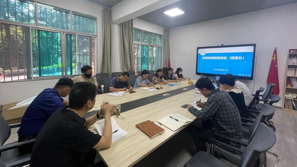 2023年6月21日,蔡冰院长、黄绍勇副院长深入教务处(双高办)调研指导工作。教务处(双高办)全体成员参与会议。