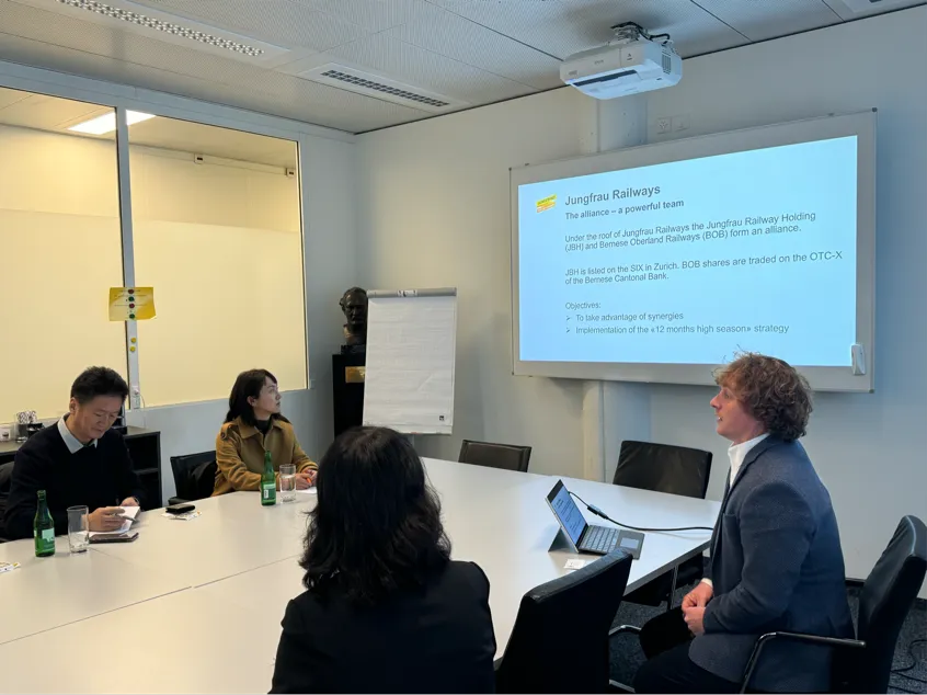 在访问少女峰火车公司期间,代表团与该公司销售经理丹尼尔•博特(Daniel Bott)等进行会谈交流。双方围绕旅游产品设计与开发这一核心议题展开了深入交流探讨。交流过程中,蔡冰院长一行详细了解了少女峰旅游产品的设计理念、历史沿革、路线规划与开发情况,以及公司的运营接待能力。此次与旅游行业人员的交流不仅加深了双方的了解,也为进一步深化合作奠定了坚实基础。