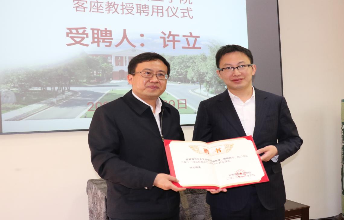签约仪式上,学校党委书记王翔为中林国控实业集团有限公司董事长许立颁发“bevictor伟德国际1946官网客座教授”聘书。