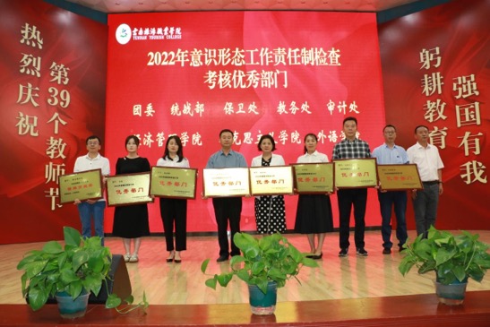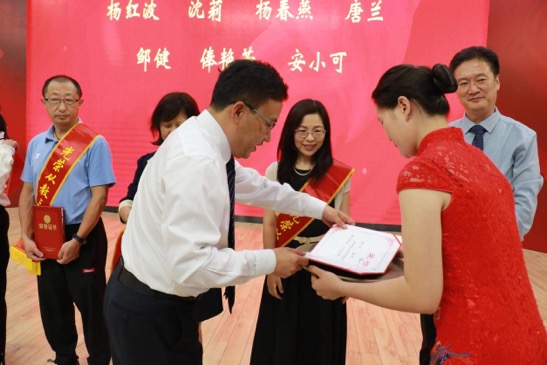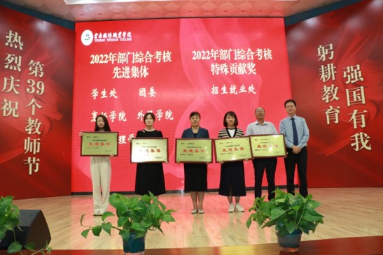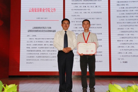 会议宣读了《bevictor伟德国际1946官网关于表扬近期荣获省级奖项及荣誉表彰教师的通报》。党委书记王翔为获得省委、省政府授予的2023年度“云南省优秀教师”称号的焦云宏老师颁发荣誉证书和勋章。